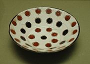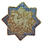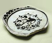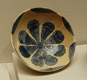 En Islam, on appelle «faïence» une céramique à pâte argileuse, couverte d'une glaçure opacifiée à l'oxyde d'étain, et décorée sur glaçure. Les imitations de porcelaines chinoises[26] se multiplient alors, grâce à de l'oxyde de cobalt, utilisé dès le VIIIe siècle à Suse[27] et qui permet des décors bleus et blancs. Le répertoire de motifs reste assez restreint : motifs végétaux, épigraphie[28].