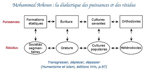 La dialectique des puissances et des résidus, expression empruntée à Henri Lefebvre, est exposée dans Humanisme et Islam : Combats et propositions, p. 95 et suivantes. Elle identifie selon Mohammed Arkoun «les déploiements de la dialectique continue de quatre puissances à vocation hégémonique cherchant à diminuer à l'état de résidus, ou alors à éliminer quatre forces directement antagonistes qui luttent pour la survie». Les quatre puissances sont la formation étatique, l'écriture, les cultures savantes et l'orthodoxie, auxquelles correspondent les quatre résidus que sont les sociétés segmentaires, l'oralité, les cultures populaires, les hérésies. Pour Mohammed Arkoun, «une double dialectique se déploie simultanément et travaille l'espace social global», d'une part entre les quatre puissances et entre les quatre résidus, et d'autre part entre chaque puissance et chaque résidu correspondant. Dans ce cadre, l'analyse sert à «mettre en application les trois opérations méthodologiques et épistémologiques exprimées par les verbes transgresser, déplacer, dépasser.»